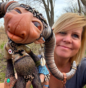 Sprite is hand sculpted and painted, she carries in her hands her protective thorn and lucky stone as she winds her way though the wilds of the wood. She is shaggy with light green spirals and has the most brilliant bright blue glass eyes to catch your attention. She watches calmly yet cautious, and stands steadily and ready on her own two feet.